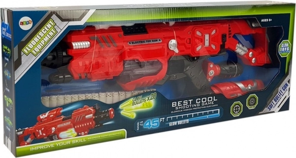Broń dziecięca, która świeci w ciemności, jest idealnym dodatkiem dla każdego dziecka, które uwielbia gry w fantazję. Jest wyposażona w efekty świetlne, które nadają grze całkowicie nowy wymiar. Magazynek świeci białym światłem, dzięki czemu pociski są widoczne nawet w ciemności. Częścią wyposażenia jest także laser, który wskazuje ścieżkę pocisku, a każde naciśnięcie spustu powoduje realistyczny dźwięk strzału.