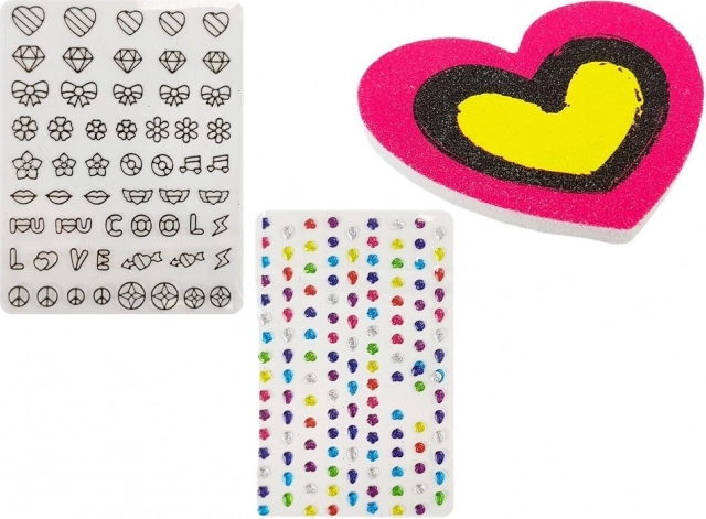 Zestaw zawiera lakier bezbarwny, dwa pojemniki z brokatem, kolorowe naklejki w kształcie serc, kwiatów i innych ciekawych form, które dodają kreatywnego akcentu każdemu projektowi.