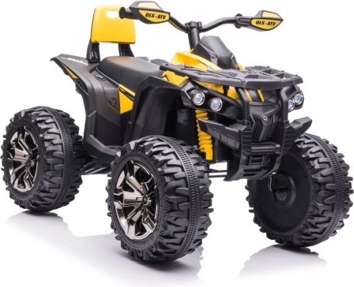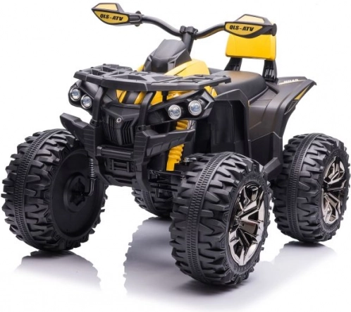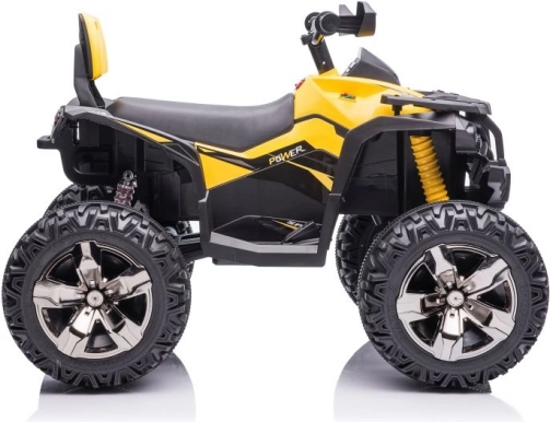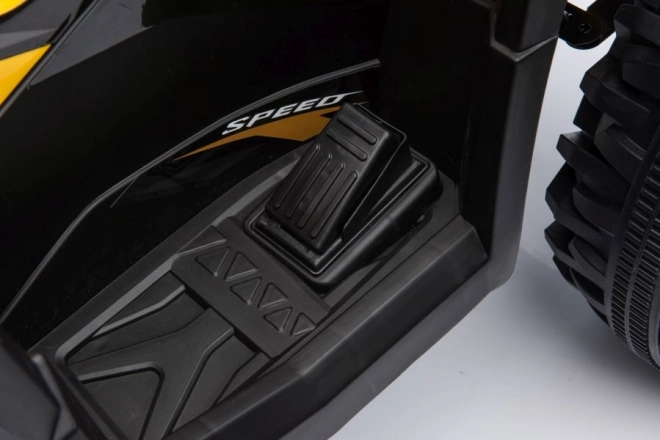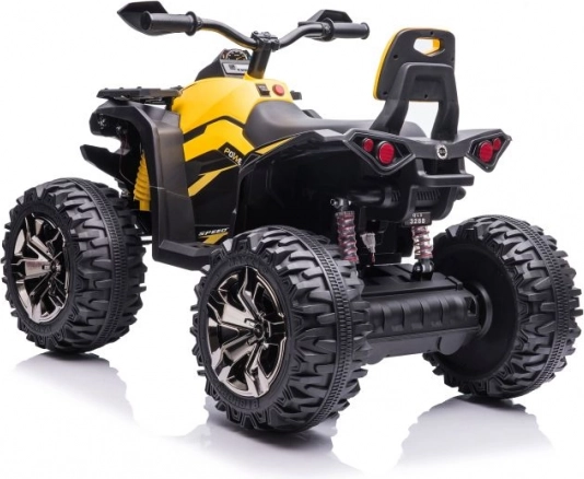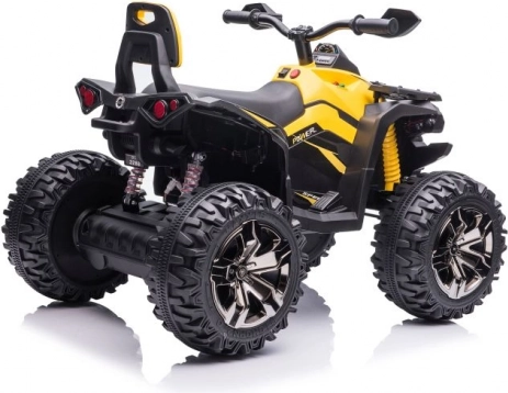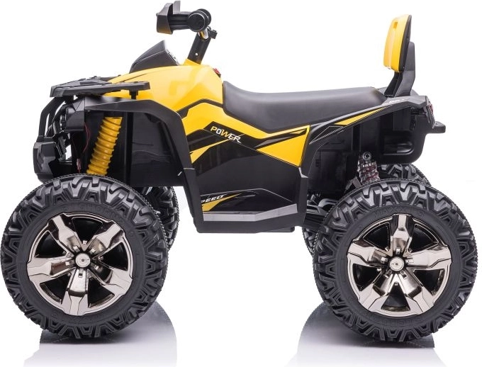 Żółto‑czarne wykończenie, kierownica z lusterkami oraz detale podwozia nadają quadzie wygląd prawdziwego ATV.
