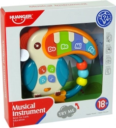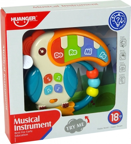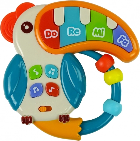 Muzyczne pianinko w kształcie papugi jest idealne do rozwoju zmysłów dziecka. Dzięki 5 kolorowym klawiszom DO RE MI FA z efektami świetlnymi dzieci mogą cieszyć się różnymi melodiami i efektami dźwiękowymi, co wzmacnia ich umiejętność rozróżniania dźwięków. Małe przyciski w kształcie nut aktywują dodatkowe funkcje, takie jak różne dźwięki i melodie.