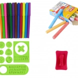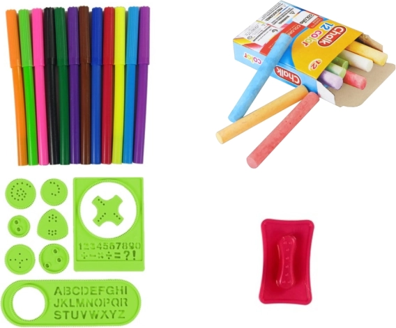 - 12 kolorowych markerów, 12 kolorowych kredek, szablon figur geometrycznych, szablon liter, świecący marker, haczyk na papier, szufladki do przechowywania