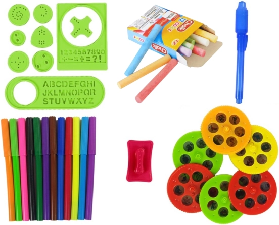 W zestawie znajduje się bogaty komplet akcesoriów: 36 szablonów obrazków, 6 dysków z motywami, 12 kolorowych markerów, 12 kolorowych kred, szablony figur geometrycznych i liter oraz specjalny marker z lampką UV, który po podświetleniu ujawnia to, co dziecko narysowało. Praktyczne przegródki utrzymują wszystko pod ręką i ułatwiają porządek.