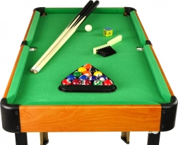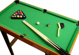 Stół zmieści się w każdym pokoju dziecięcym, wysokość jest dostosowana do najmłodszych. Pole gry wyłożone jest zielonym materiałem używanym w większych odpowiednikach stołów bilardowych. W otworach na bile zamontowano siatki.