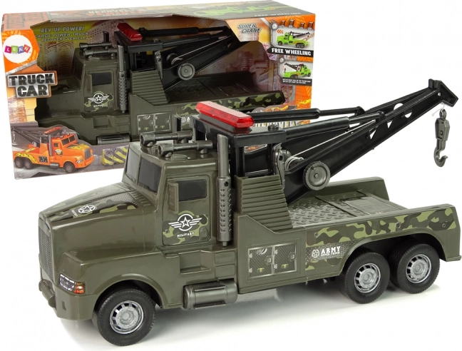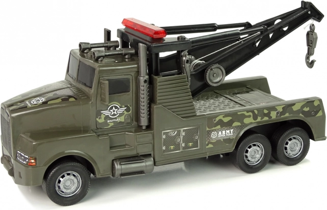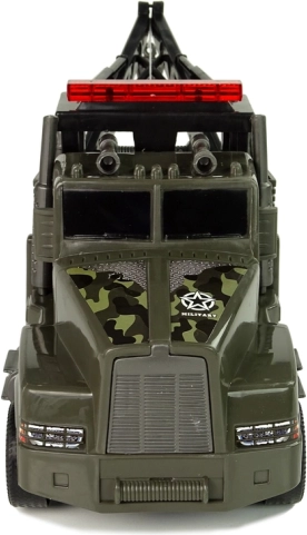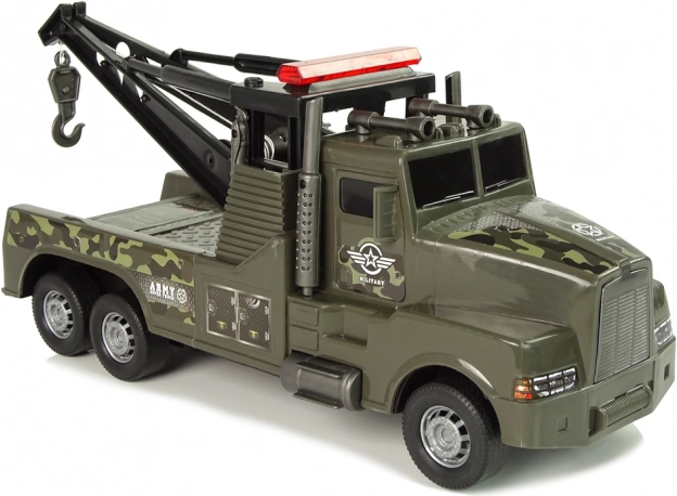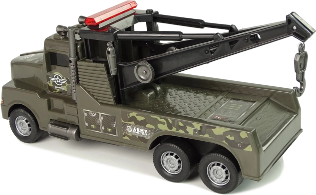 Ta plastikowa laweta z kamuflażowym nadrukiem i wojskowymi naklejkami zachwyci wszystkie dzieci, które kochają akcję i misje ratunkowe. Z tyłu znajduje się dźwig z wyciągarką, wysuwany za pomocą bocznej korbki, zakończony solidnym hakiem do łatwego mocowania innych zabawek.