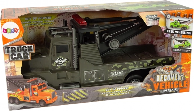 Dziecięca laweta w skali 1:10 w wzorze moro zapewnia realistyczną zabawę i wspiera kreatywną grę. Funkcyjny dźwig z wysuwaną liną wyciągarki i hakiem pozwala „holować” inne zabawki, a napęd frykcyjny gwarantuje szybką jazdę. Idealna dla małych fanów pojazdów wojskowych.