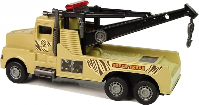 Ta szczegółowo wykonana laweta „Super Truck” jest idealna do dynamicznych scenariuszy na dziecięcej budowie oraz podczas „wypadków drogowych”. Tylni żuraw z wysuwaną linką i hakiem obsługiwany jest praktyczną boczną korbką, dzięki czemu dziecko łatwo zaczepi i przemieści inne autko na „pole bitwy” lub parking.