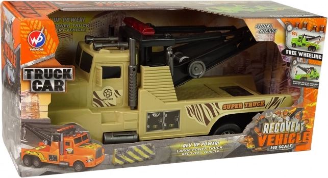 Solidna plastikowa laweta w skali 1:10 z działającą wyciągarką i hakiem ucieszy małych miłośników budów i dróg. Dzięki napędowi ciernemu po naciągnięciu rusza do przodu, a ruchomy żuraw z linką odholuje inne zabawki. Jej wojskowy design wspiera kreatywną zabawę. Odpowiednia dla dzieci od 3 lat, spełnia normy CE i EN71.