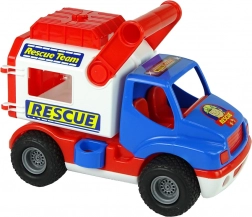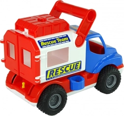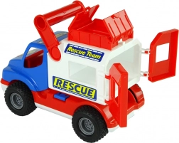 Pojazd wyposażono w gumowe koła z antypoślizgowym bieżnikiem dla płynnej jazdy, ma otwierane tylne czerwone drzwi oraz górny schowek na drobiazgi. Boczna blokada utrzymuje zabudowę stabilnie – po zwolnieniu staje się mobilna i dźwignią można ją odchylić do tyłu. Naklejki z motywem „Rescue/Rescue Team” wspierają tematyczną zabawę.