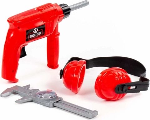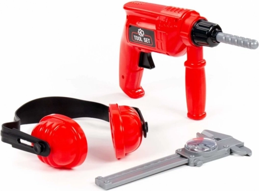 Zestaw narzędzi dla dzieci – czerwona wiertarka, ochronniki słuchu i suwmiarka