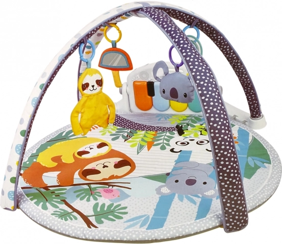Ta miękka i bezpieczna edukacyjna mata z motywem dżungli oferuje maluszkowi inspirującą przestrzeń do codziennego odkrywania. Kolorowe wiszące zabawki (koala, leniwiec, grzechotki) oraz panel odbijający działający jak lusterko naturalnie motywują dziecko do sięgania, chwytania i obracania się. W zestawie znajduje się odpinane pianinko ze świecącymi klawiszami, które po naciśnięciu wydają dźwięki i melodie – idealne dla rozwoju słuchu i poczucia rytmu.