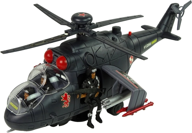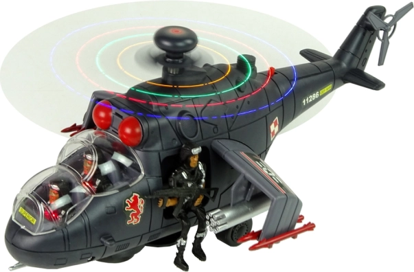 Wykonany z wytrzymałego materiału plastikowego, z ogromnymi obrotowymi skrzydłami wyposażonymi w kolorowe diody LED. Wewnątrz kokpitu znajdują się figurki żołnierzy – trzy w zestawie, jeden z nich z karabinem gotowy na misję.