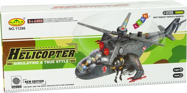 Efektom świetlnym towarzyszą efekty dźwiękowe, na przykład dźwięk startu i strzałów. Koła pod helikopterem umożliwiają ruch.