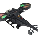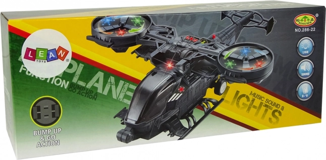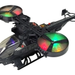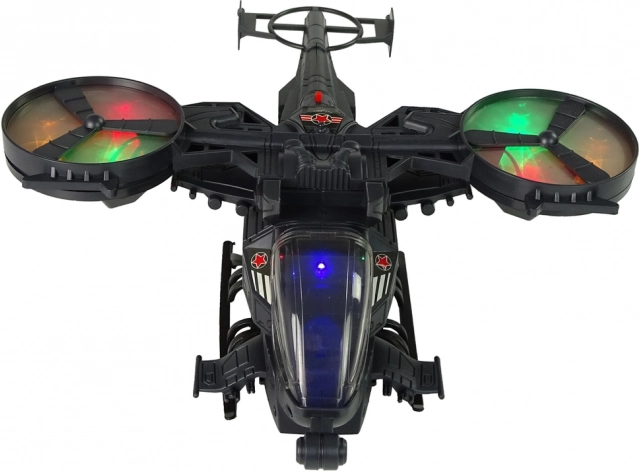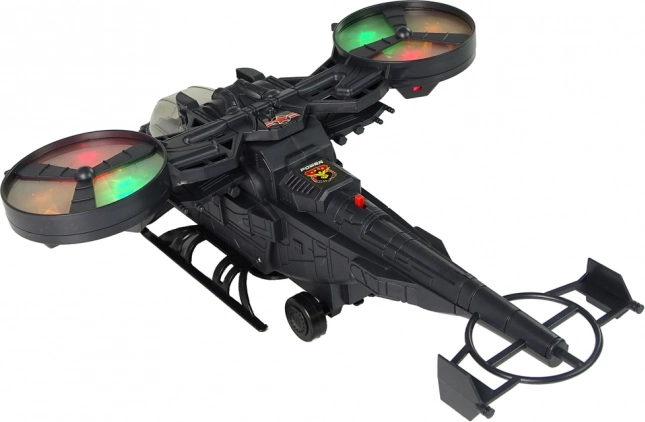 Helikopter ma duże, obrotowe wirniki, które świecą w różnych kolorach i uzupełnione są efektami dźwiękowymi imitującymi start i strzały. Dzięki kółkom umieszczonym w dolnej części helikopter może poruszać się po ziemi.