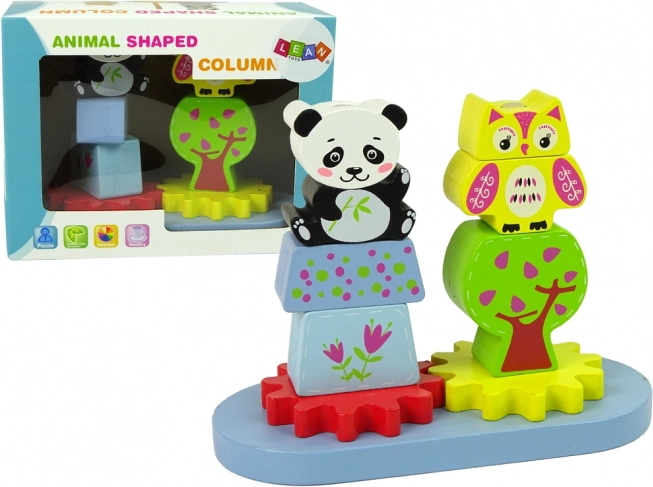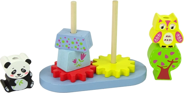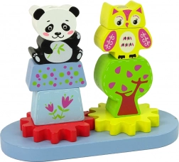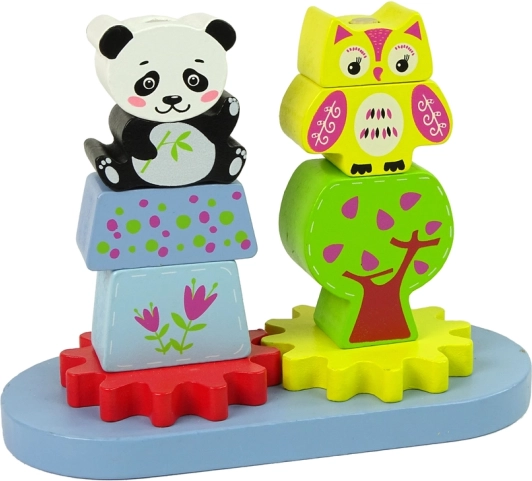 Ten fantastyczny drewniany zestaw składa się z podstawy z klockami o różnych kształtach i rozmiarach, które przedstawiają zwierzęta, takie jak panda i sowa. Zawiera także dwa koła zębate, które dodają zabawie ruchu. Klocki są idealne do rozwijania manualnych i precyzyjnych umiejętności małych dzieci, gdy umieszczają je na wystających trzpieniach.