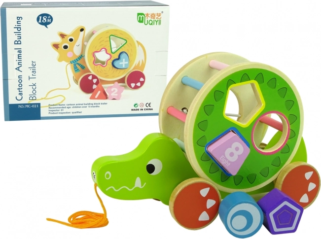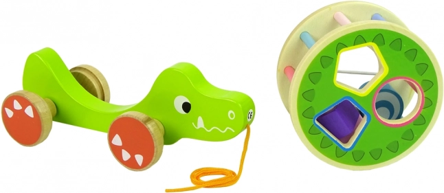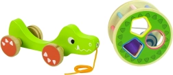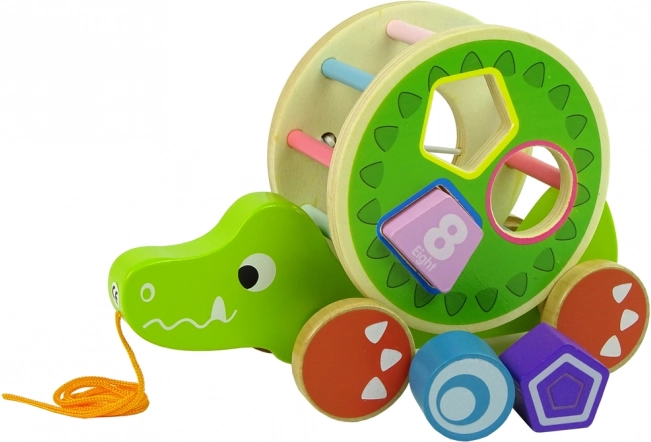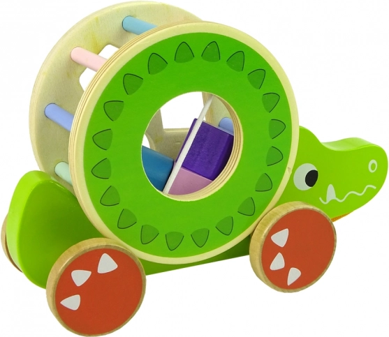Drewniana zabawka krokodyl z sorterem oferuje szereg elementów edukacyjnych. Duże kółko z sorterem i trzema klockami na grzbiecie pozwala ćwiczyć precyzję, rozpoznawanie kształtów geometrycznych oraz poprawia koncentrację i myślenie logiczne. Krokodyl wyposażony jest w kolorowe patyczki, które stymulują wzrok dziecka, a kółka ze sznurkiem ułatwiają poruszanie zabawki. Klocki w środku pełnią funkcję grzechotki, co przyciąga uwagę dzieci i pobudza zmysł słuchu. Zdejmowany okrąg na grzbiecie krokodyla umożliwia różne warianty zabawy.