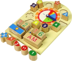 Drewniany zegar edukacyjny dla najmłodszych łączy zabawę z nauką. Dzięki niemu dziecko nauczy się rozpoznawać kształty, kolory oraz odczytywać godziny. Żywe kolory pobudzają dziecięcą wyobraźnię i kreatywność.