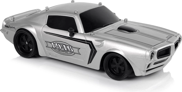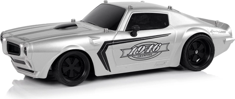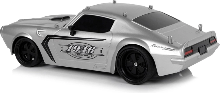 Pojazd ma lekką i solidną konstrukcję, sportowy design z czarnymi szybami oraz czarnymi detalami na masce i naklejkami Champion 1946. Gumowe opony gwarantują przyczepność do nawierzchni podczas jazdy. Sterowanie pojazdem to świetna zabawa zwłaszcza dla najmłodszych, dlatego dołączony do zestawu pilot pozwala kierować małym modelem za pomocą dwóch oddzielnych przycisków do jazdy do przodu/tyłu oraz skręcania.