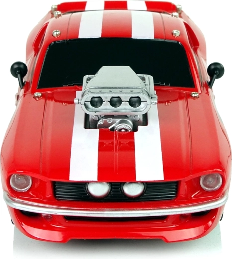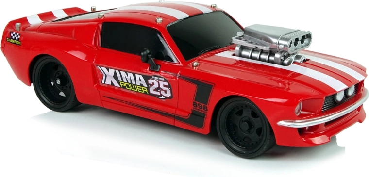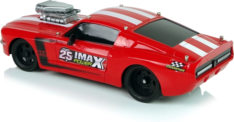 Autko ma lekką i solidną konstrukcję, sportowy design z dwoma białymi pasami na dachu, a srebrny kompresor na masce dodaje efektu. Gumowe opony gwarantują przyczepność do nawierzchni podczas sterowania pojazdem.