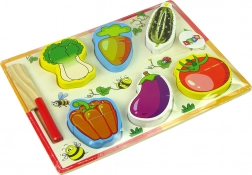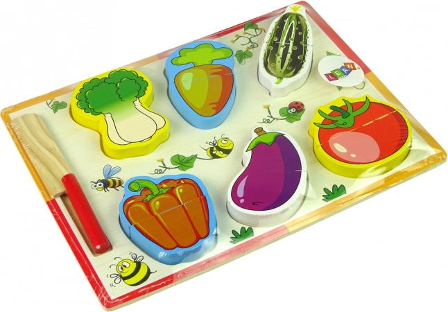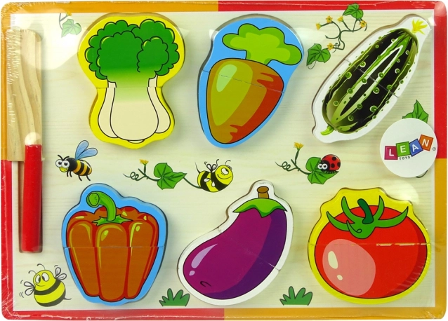 - Zawartość zestawu: bakłażan, marchewka, pomidor, kapusta, ogórek, papryka, drewniany nóż, deska do krojenia