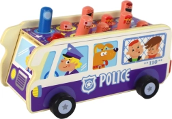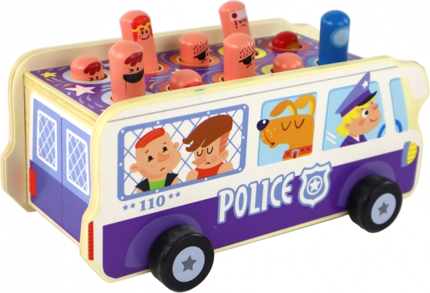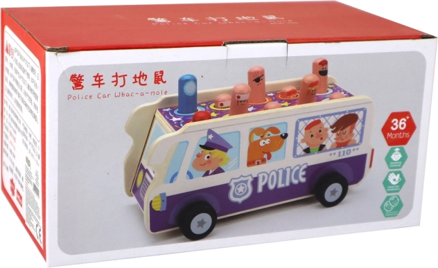 Zabawna drewniana gra zręcznościowa w formie policyjnego autobusu rozwija małą motorykę, koordynację oko–ręka oraz szybkie reakcje. Dzieci „zbijają” wyskakujące figurki młotkiem, a dzięki kółkom mogą też jeździć autobusem. Wysokiej jakości drewniane wykonanie, bezpieczne materiały, certyfikacja CE i zgodność z EN71 dla spokojnej i bezpiecznej zabawy.