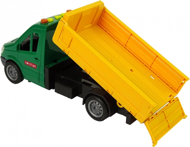 Ten szczegółowo wykonany samochód ciężarowy w zielono‑żółtej kolorystyce przyciąga wzrok dzieci od pierwszego spojrzenia. Dzięki napędowi ciernemu wystarczy lekko popchnąć, a pojazd sam ruszy naprzód. Wywrotka i wysuwane podwozie ułatwiają załadunek i przewóz wszystkich akcesoriów.