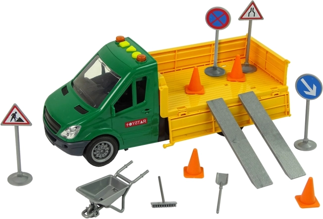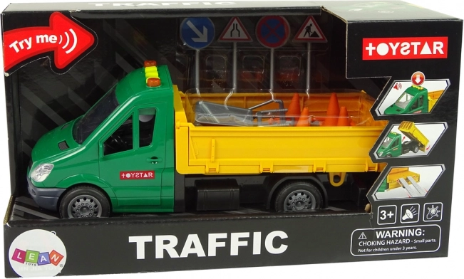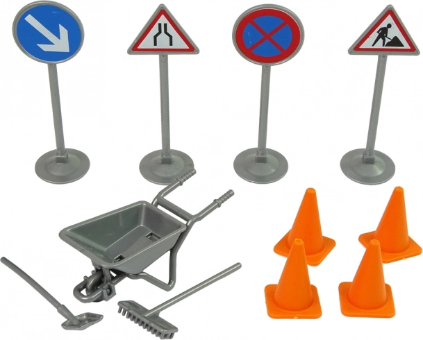 Pachołki, znaki, taczka, łopata i inne narzędzia tworzą realistyczny plac budowy. Dzieci w zabawny sposób uczą się znaków i zasad ruchu drogowego.