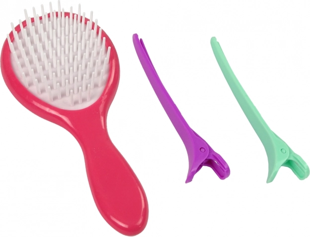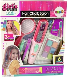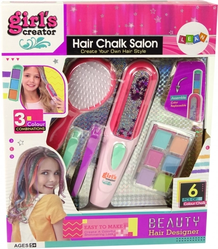 Poznajesz zestaw, który zawiera szczotkę, prostownicę, dwie spinki oraz sześć kolorowych kred do włosów.