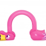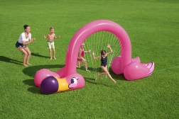 Ta duża nadmuchiwana bramka ze zraszaczami w formie flaminga, podłączana do węża ogrodowego, tworzy świetny wodny tunel, pod którym dzieci przebiegają i dają się zraszać delikatnymi dyszami. Dzięki wysokości 1,93 m do zabawy mogą dołączyć także dorośli.