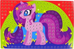 Obrazek z kucykiem i ponumerowanymi polami ułatwia układanie kolorowych kwadracików.