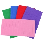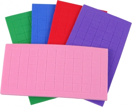 Zestaw zawiera kolorowe piankowe kwadraciki w pięciu różnych kolorach: różowym, fioletowym, niebieskim, czerwonym i zielonym.