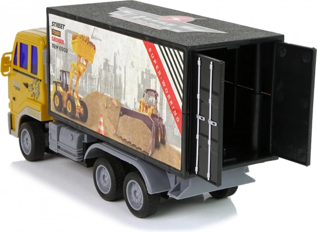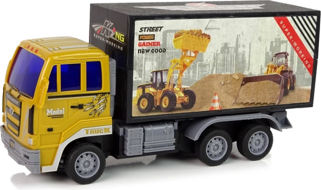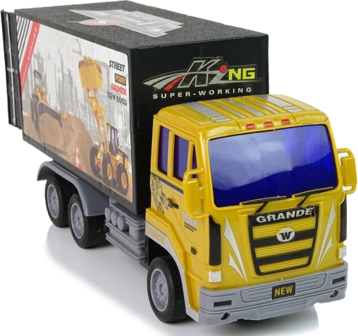 Ciężarówka ma żółtą kabinę i czarny kontener z wyraźnymi naklejkami, wiernie imitując prawdziwą maszynę budowlaną.