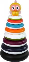 Zestaw zawiera różne pierścienie, które można układać według dziecięcej wyobraźni. Żółta kaczuszka na szczycie piramidy jest atrakcyjnym elementem, który dodatkowo czyni dźwięk podczas ruchu. Jej skrzydła są wykonane z miękkiej gumy, co czyni je idealnymi jako gryzak. Kolorowe wykonanie ze zwierzątkami wspiera rozwój twojego dziecka i poznawanie otaczającego świata, oferując edukacyjną i zabawną grę.