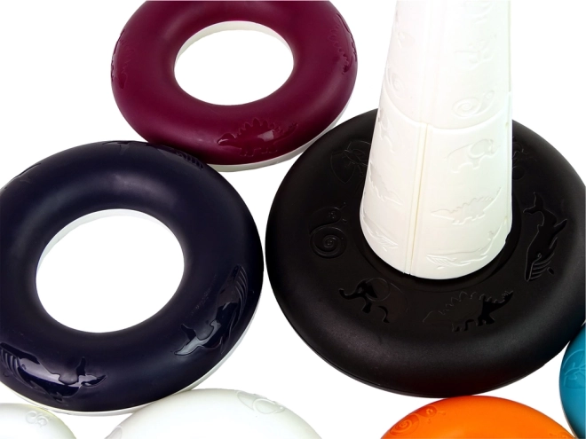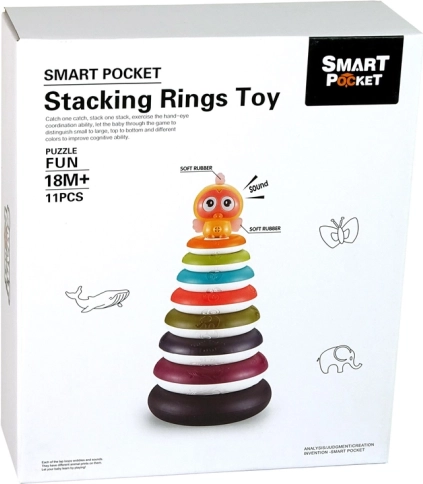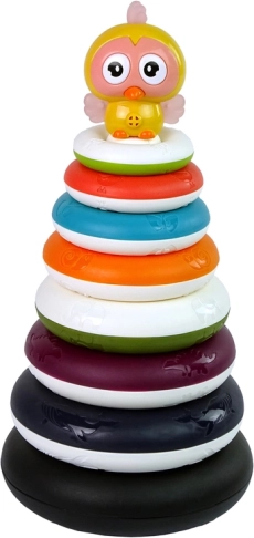 Piramida do układania jest wyposażona w jaskrawe kolory i motywy zwierząt, które pomagają w rozpoznawaniu kolorów i poprawiają zmysłowe postrzeganie dziecka.