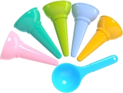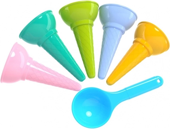 Zamień piasek w małą lodziarnię! Ten zestaw kolorowych foremek do rożków lodowych z nabierakiem zapewnia godziny kreatywnej zabawy na plaży i w piaskownicy. Zawiera 5 rożków + nabierak z trwałego, bezzapachowego plastiku w pastelowych kolorach. Odpowiedni dla dzieci od 1. roku życia, z certyfikatem CE.