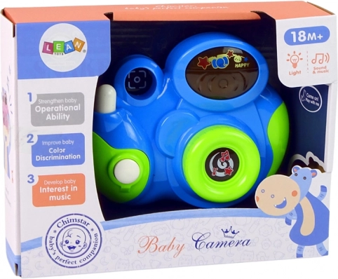 Ten zabawny i bezpieczny aparat dla dzieci pomaga maluchom odkrywać świat poprzez naśladowanie dorosłych. Po naciśnięciu przycisków uruchamia 3 melodie, kolorowe światła jak błysk oraz realistyczny dźwięk „pstryknięcia”. Obrotowy obiektyw dodatkowo przy obracaniu przyjemnie grzechocze, co pobudza ciekawość i rozwija małą motorykę.