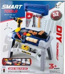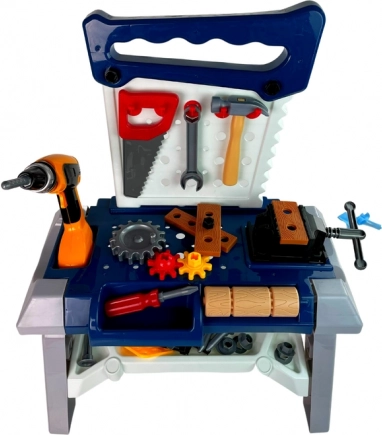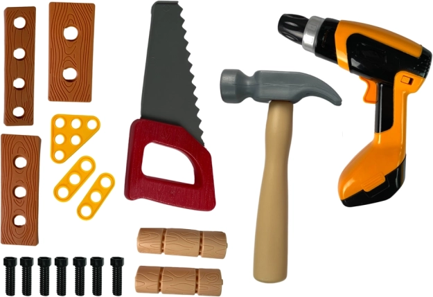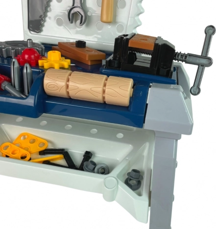 W zestawie znajduje się szeroki wachlarz narzędzi i dodatków: klucze imbusowe i płaskie/oczkowe, imadło, piła, szczypce, młotek, wkrętaki, śruby i nakrętki, koła zębate, drewniane (plastikowe) listewki do wkręcania, boczne pojemniki na drobiazgi oraz haczyki do organizacji narzędzi. Warsztat łatwo się składa i rozkłada, a do tego zajmuje mało miejsca.