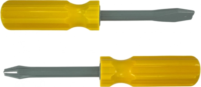 Płaski i krzyżowy śrubokręt z ergonomiczną rękojeścią pomagają dzieciom ćwiczyć prawidłowy chwyt i precyzję podczas wkręcania.