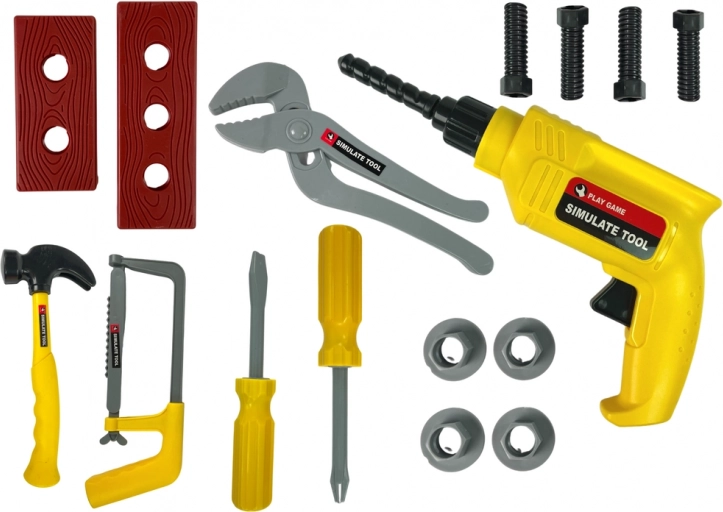 W zestawie znajduje się symulowana wiertarka, młotek, piłka oraz szczypce – wszystko w wykonaniu przypominającym prawdziwe narzędzia, co zachęca do naśladowania dorosłych.