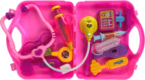 Uroczy różowy lekarski kuferek dla małych doktorów zapewni godziny kreatywnej zabawy i nauki. Zawiera bezpieczne plastikowe narzędzia oraz świecący stetoskop, który po przyłożeniu zapala serduszko. Dzieci ćwiczą małą motorykę, wyobraźnię i łatwiej pokonują strach przed wizytą u lekarza. Wszystko mieści się w praktycznym przenośnym kuferku.