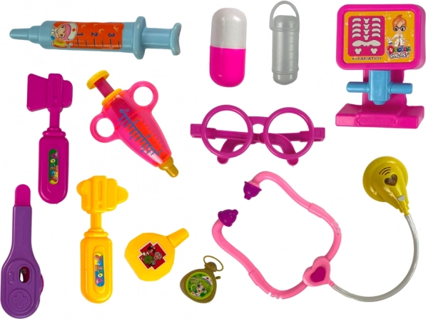 - Zawartość zestawu: 2× strzykawka, młoteczek chirurgiczny, zdjęcie RTG, termometr, duże pudełko w kształcie tabletki, małe pojemniczki na „leki”, stetoskop z serduszkiem, okulary, nożyk, lusterko.
