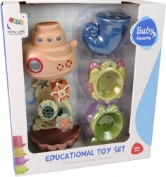 W wyposażeniu zestawu znajdują się plastikowe kubeczki w kształcie morskich stworzeń z otworami, które umożliwiają obserwowanie różnych prądów wody.