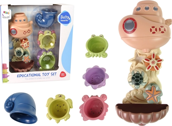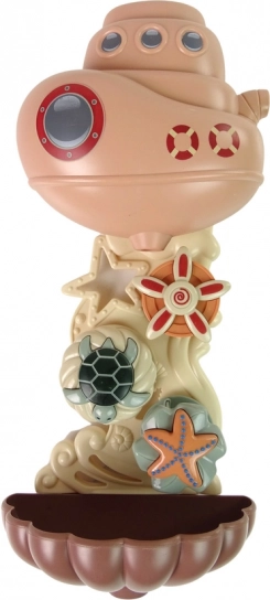 Duża łódź w kształcie morskiego świata tworzy niesamowity wodospad. Pod prądem trzepoczą się kolorowe kółka z wzorami morskich stworzeń. Zabawka łatwo się mocuje do wanny za pomocą przyssawek z tyłu.