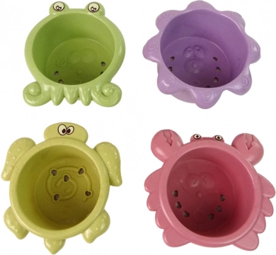 Kubeczki z różnymi otworami do obserwacji różnych prądów wody. Dzięki temu dzieci uczą się bawiąc się.