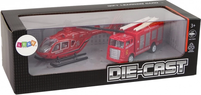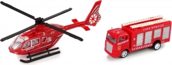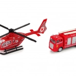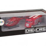 W zestawie znajduje się strażacki samochód, helikopter oraz 6 kart z różnymi pojazdami. Świetna zabawa dla dzieci od trzeciego roku życia, zabawka jest zgodna z normą EN71.