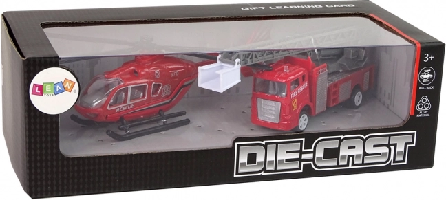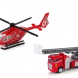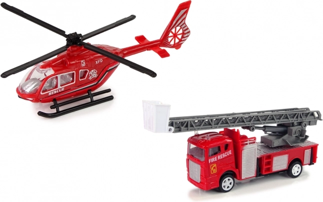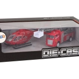 Zestaw zawiera dwa samochody strażackie i helikopter oraz sześć kart z różnymi pojazdami. Wymiary zabawek umożliwiają łatwą obsługę nawet najmniejszym rączkom.