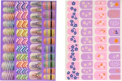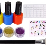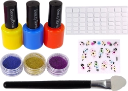 Ozdób swoje paznokcie za pomocą różnych wzorzystych naklejek oraz sypkiego brokatu w trzech intensywnych kolorach.