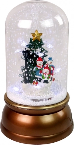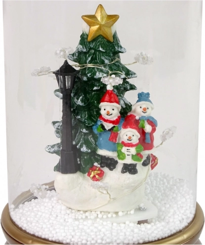 Stylowa szklana kula świąteczna ze scenką radosnej rodzinki bałwanków przy choince nada Twojemu wnętrzu wyjątkowy świąteczny charakter. Wewnętrzna pompka cyrkuluje śnieg z podstawy i rozpyla go od góry, tworząc realistyczny efekt padającego śniegu. Dekoracja jest oświetlona przyjemnym białym światłem, które wprowadza przytulną zimową atmosferę.