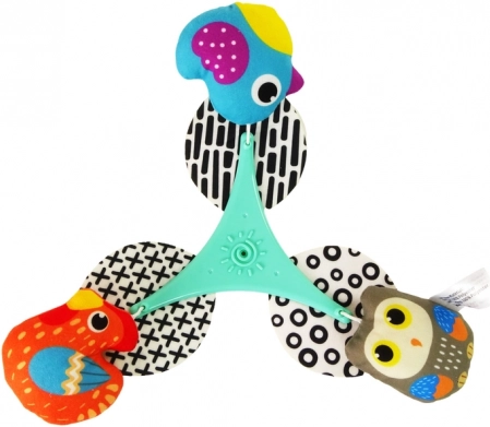 Miękkie zawieszki w żywych barwach wspierają percepcję wzrokową i motorykę małą, gdy maluszek wyciąga do nich rączki.