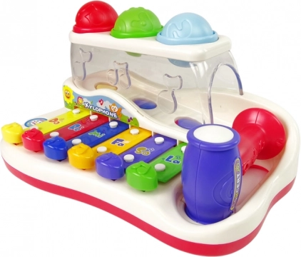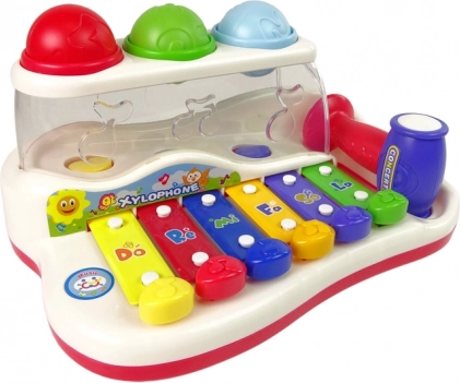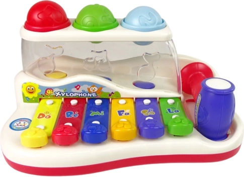 Ten kolorowy dziecięcy ksylofon łączy zabawkę muzyczną z wesołym torem kulkowym. Klawisze w żywych barwach po stuknięciu wydają przyjemne tony, a dziecko w zabawny sposób uczy się rozróżniać dźwięki, rytm i proste melodie. Kolorowe piłeczki można wbijać młoteczkiem i obserwować ich drogę kończącą się z boku zabawki – motywuje to do dalszej zabawy i trenuje koordynację ręka–oko.