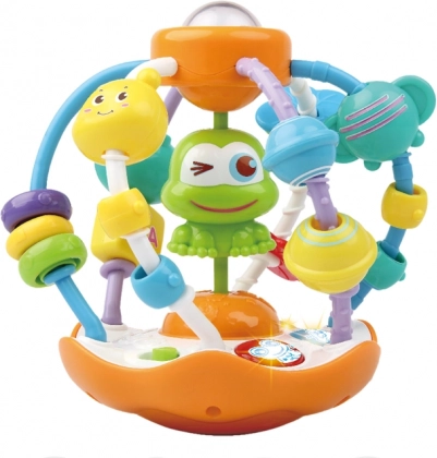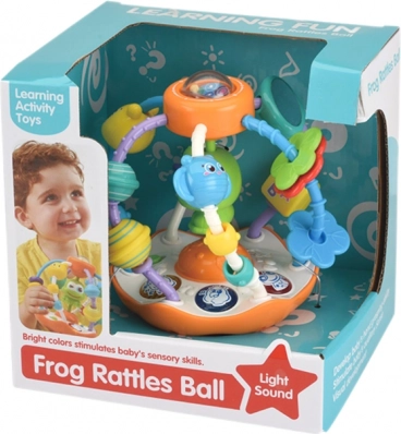 Ta kolorowa interaktywna kula to idealna pomoc do wszechstronnego rozwoju maluszków. Dzięki różnym kształtom, kolorom, dźwiękom i światłu stymuluje wzrok, słuch i dotyk oraz naturalnie rozwija myślenie logiczne. W środku kryje się wesoła żabka, która przy potrząsaniu porusza się w górę i w dół, a na szczycie znajdziesz obrotową kuleczkę do dalszego odkrywania.